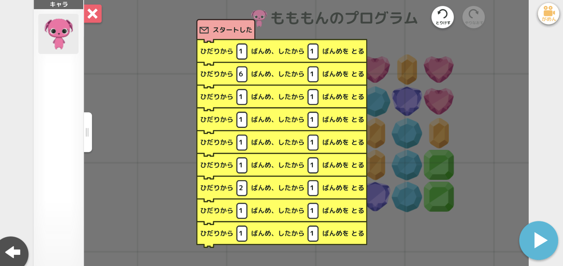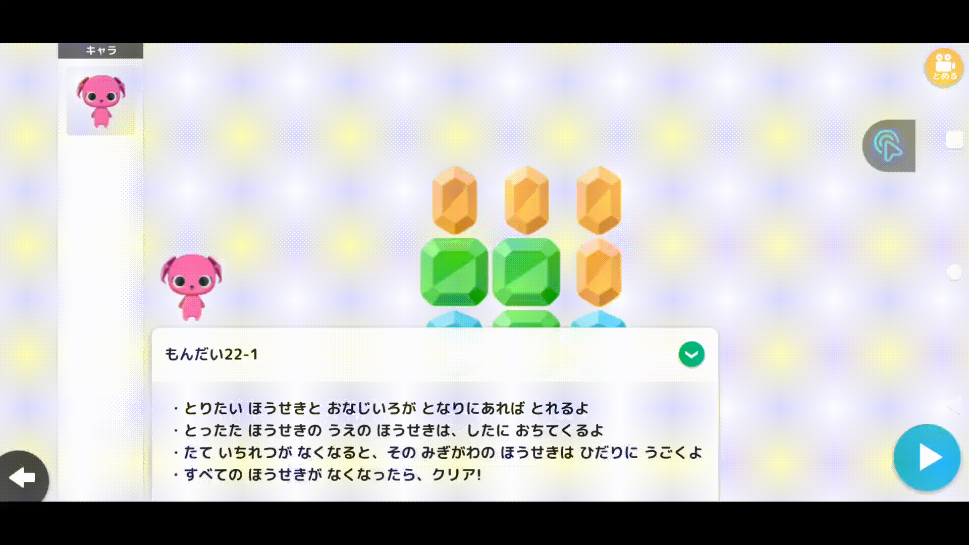 取 りたいほうせきと同 じ色 が隣 にあれば取 れるよ。