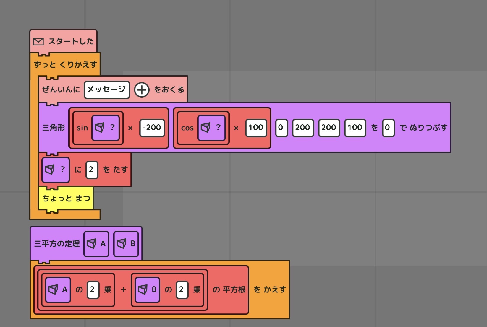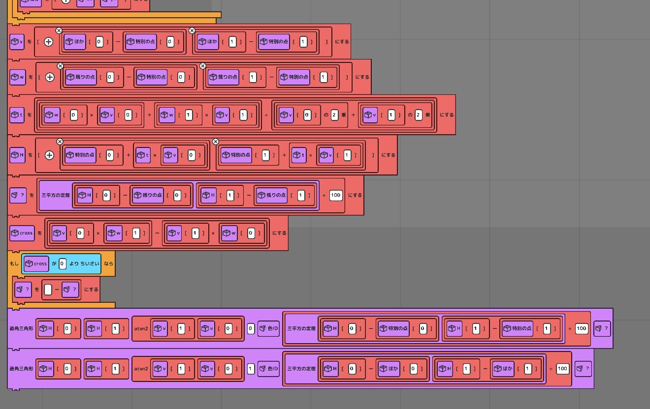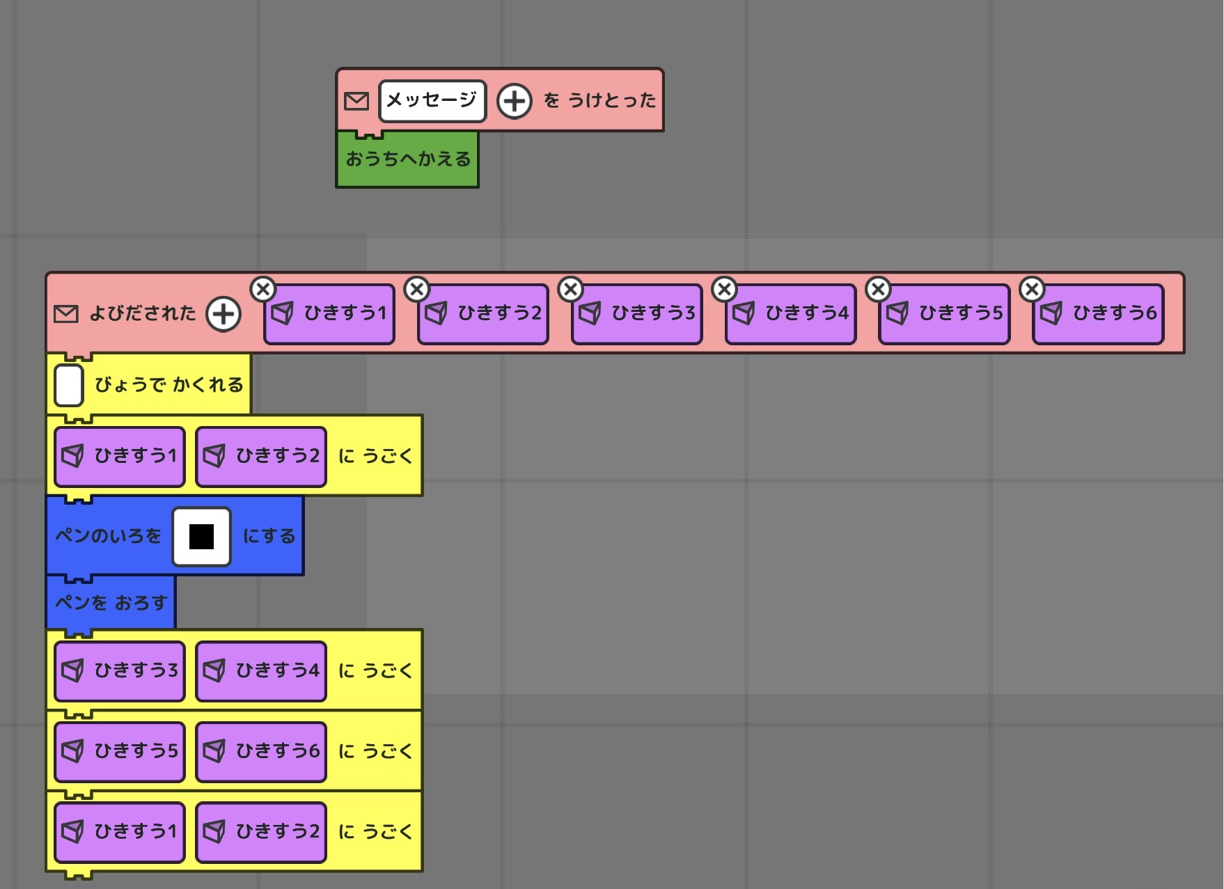 | ペン方式 | ・Scratchのプログラムが使える ・制作が(比較的)簡単 | ・変形スプライト式と比べて重い ・擬似的なテクスチャ描画ができない。 |