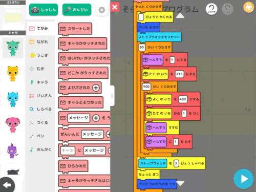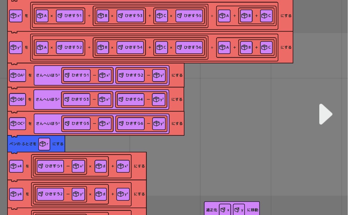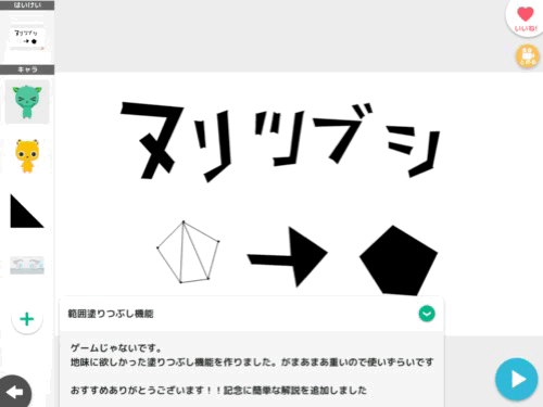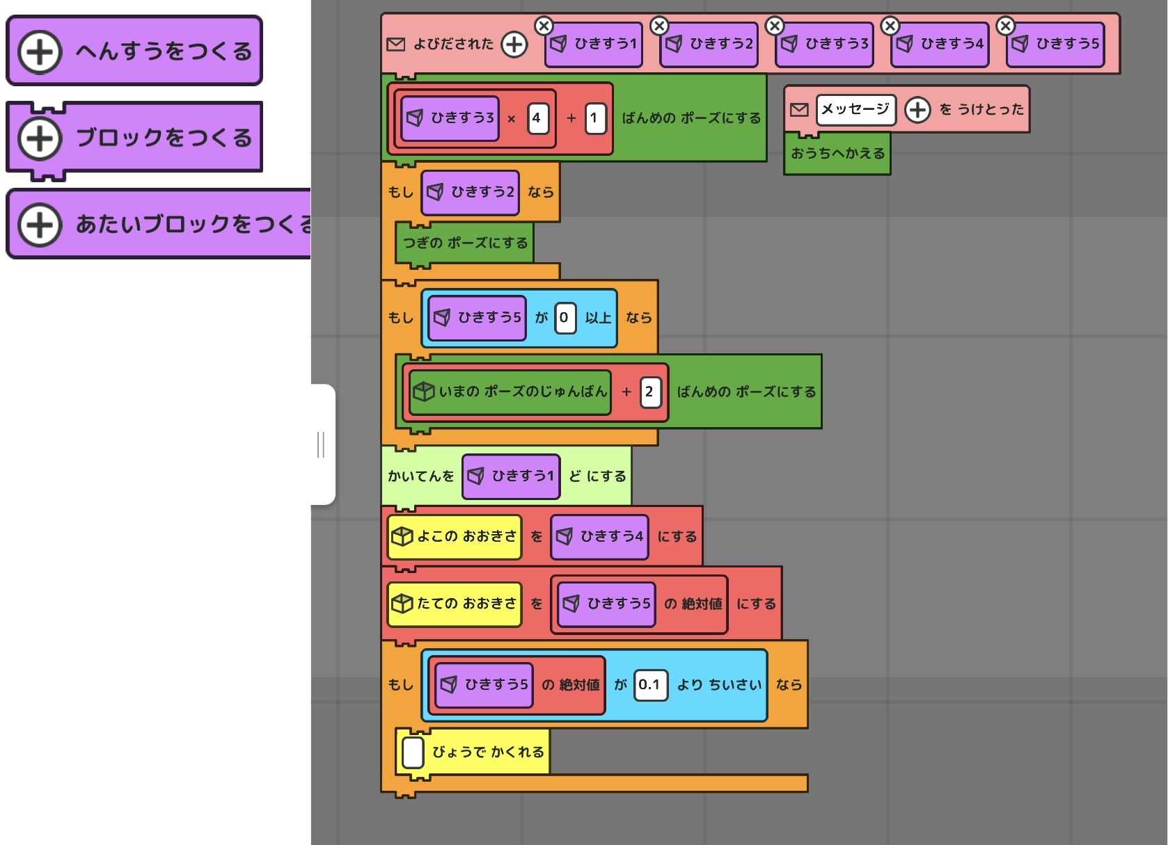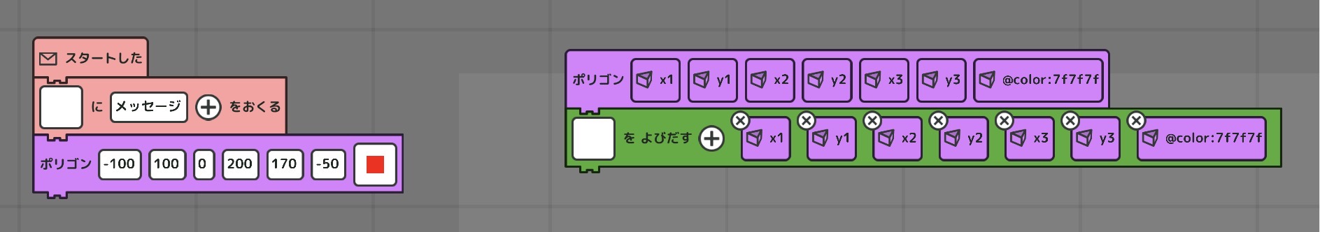 | ペン方式 | ・Scratchのプログラムが使える ・制作が(比較的)簡単 | ・変形スプライト式と比べて重い ・擬似的なテクスチャ描画ができない。 |