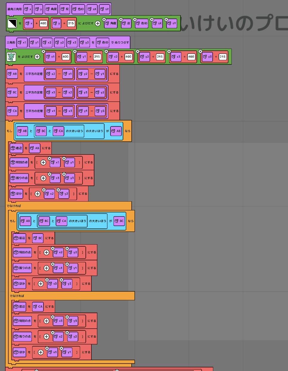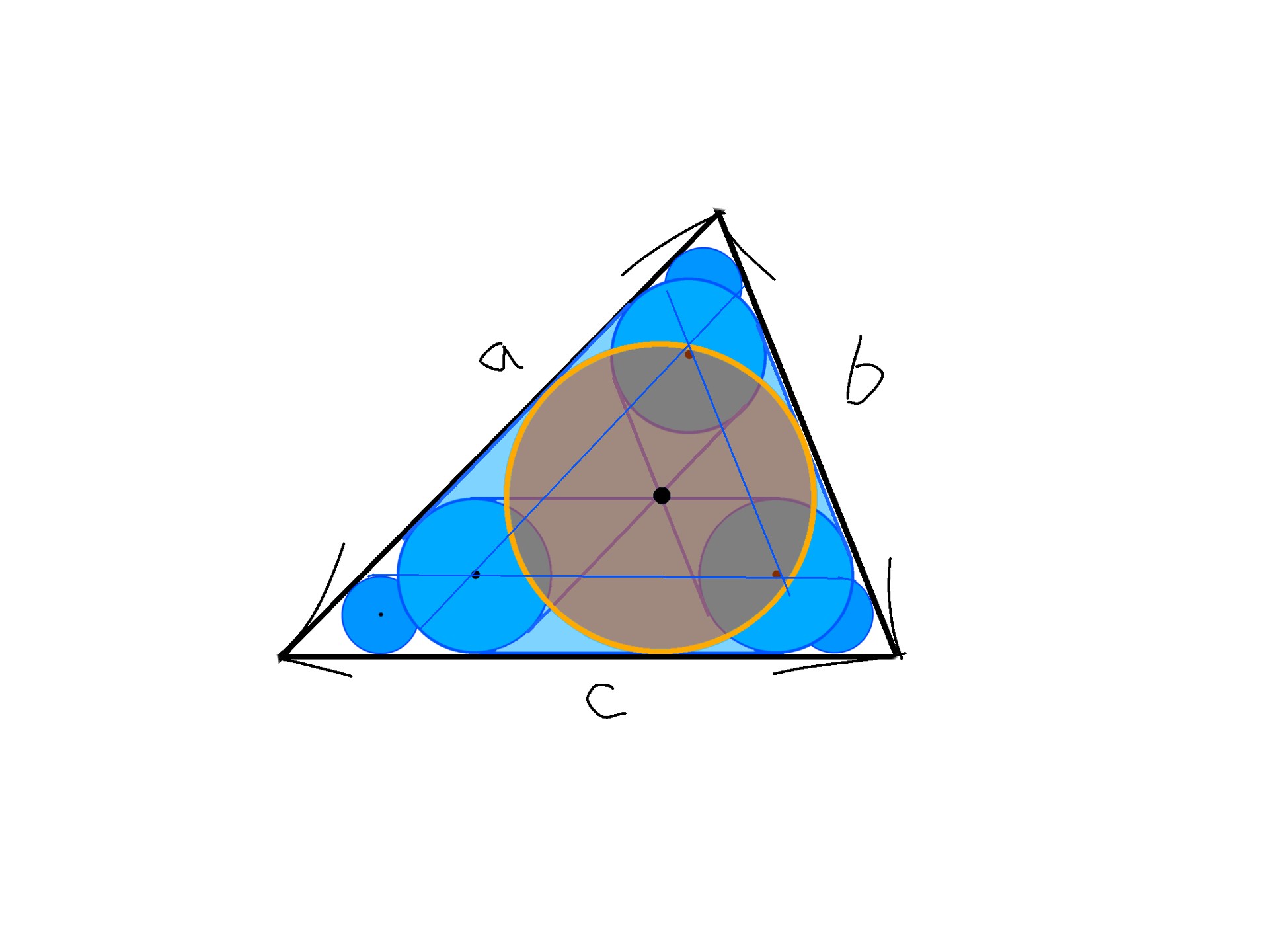 内接円を求めたあとは描画を行うx4,y4 x5,y5 x6,y6に内接円の中心の座標をいれて、内接円の大きさを1/2 1/4と減らし、描画の行う座標を頂点に近づけながら描画していけばきれいな三角形が塗りつぶせます。